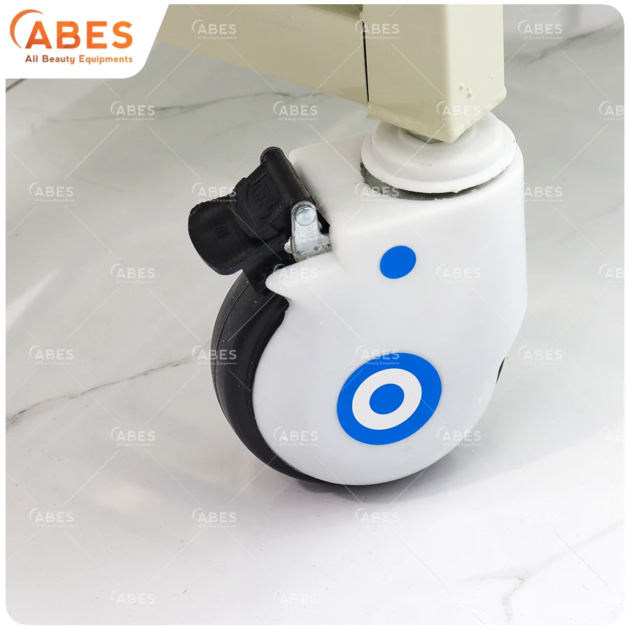 • Bánh xe di chuyển 360 độ: Bốn bánh xe đúc kích thước lớn (đường kính 13cm) cho phép xoay vòng 360 độ mượt mà. Hệ thống này giúp việc điều hướng, di chuyển giường cùng bệnh nhân qua các hành lang, khúc cua phòng khám trở nên dễ dàng. Hệ thống khóa chốt độc lập trên từng bánh xe giúp cố định giường tuyệt đối an toàn khi thao tác y tế.